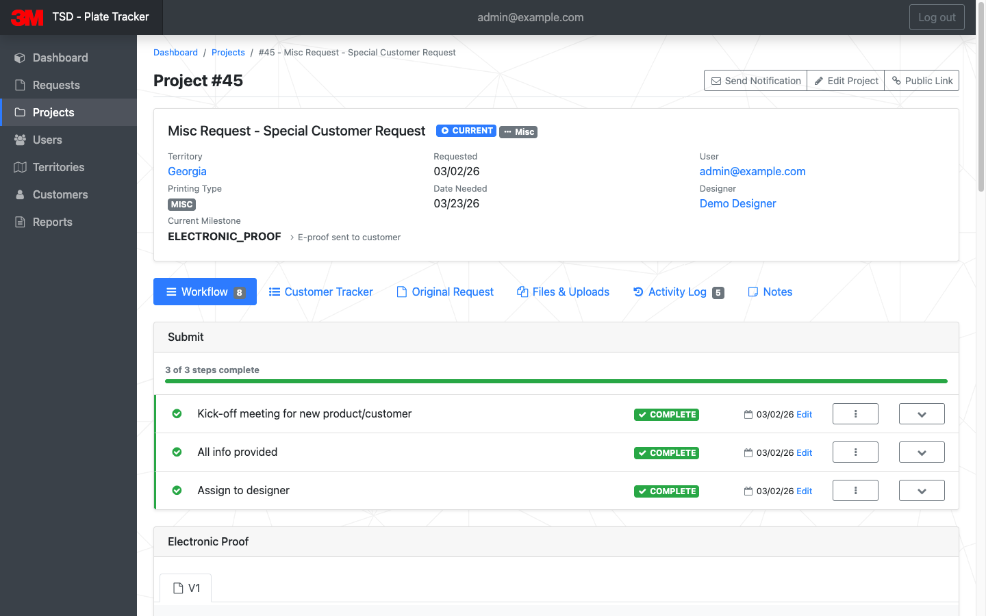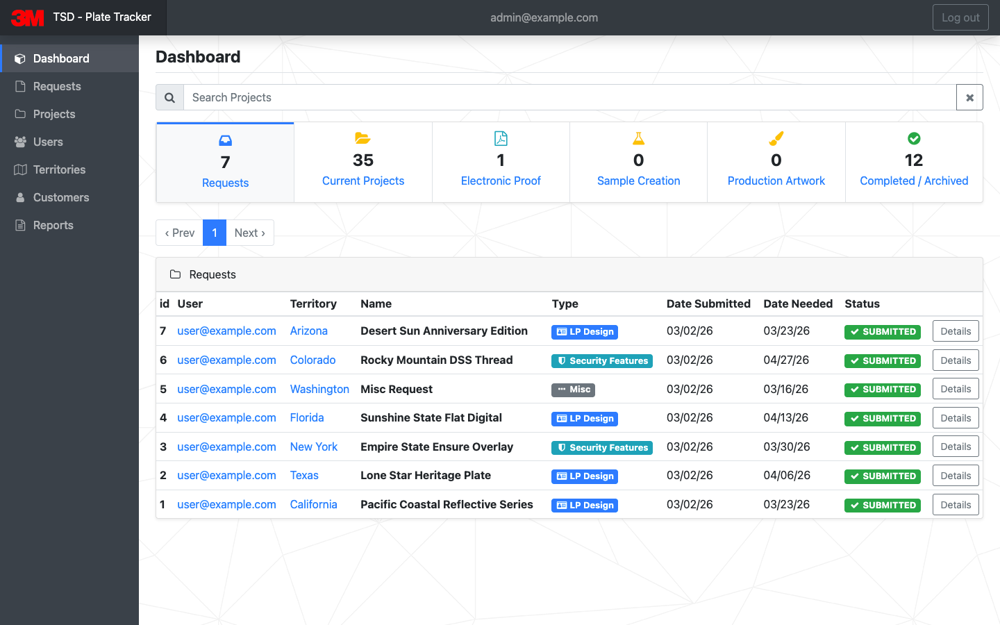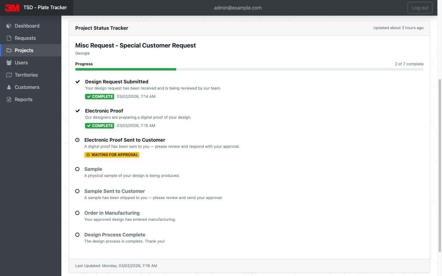 - Real-Time Confirmation and Tracking: Once a request was submitted, both the state DMV and 3M received real-time confirmation and a tracking ID. The state could easily track the status of their request, and 3M would immediately be notified to begin the review and design process.
