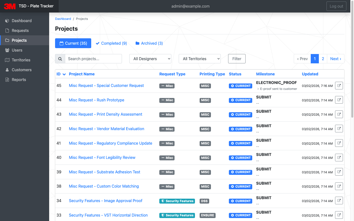 - Status Tracking: Both 3M and the state DMV could track the status of each request at any point in the workflow. The system provided a visual indicator of each request's current status, such as "In Design," "Under Review," or "Ready for Production," giving all parties clear visibility into the progress of each request.